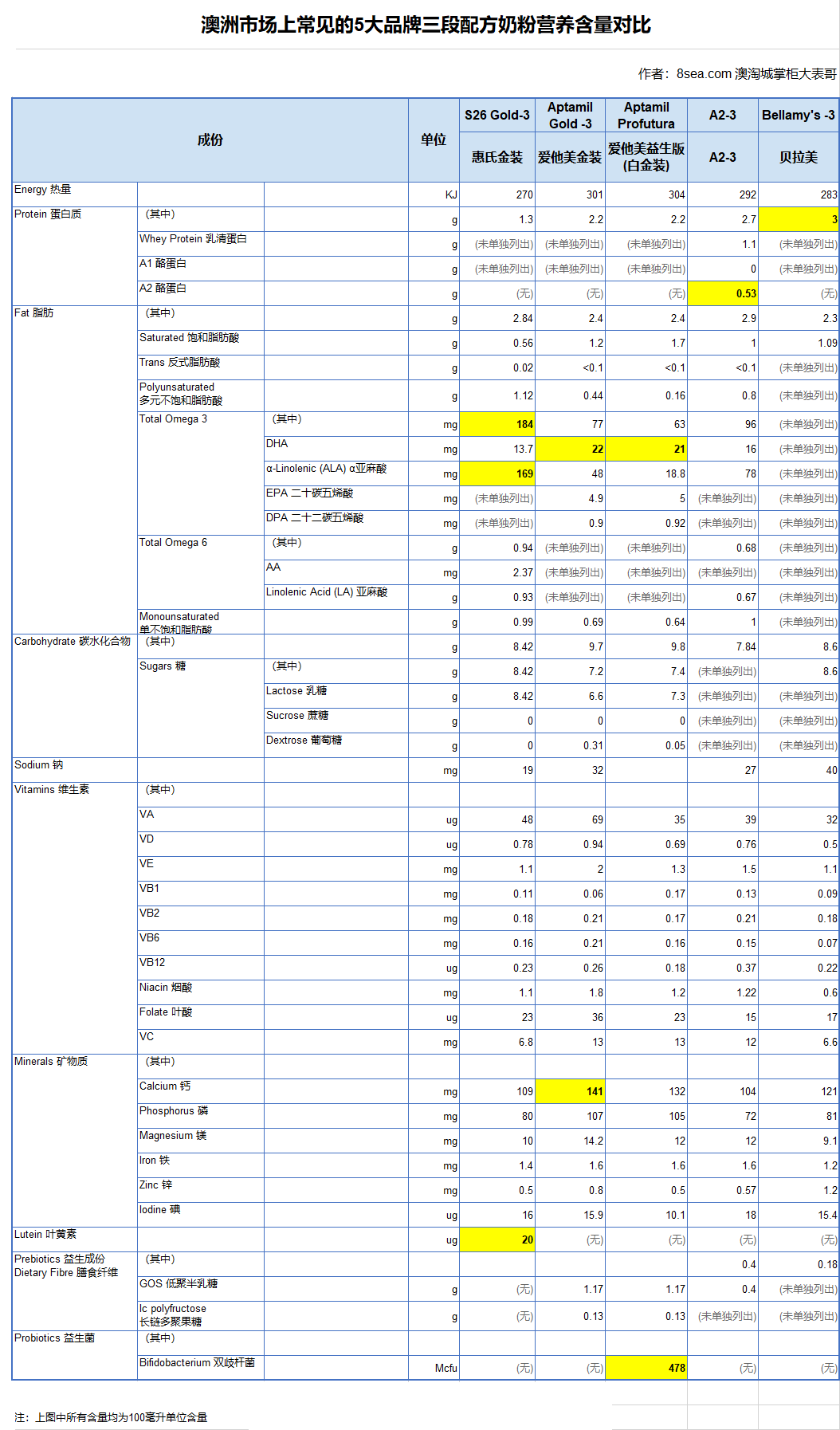 由于0到12个月的宝宝很多都是母乳喂养,一段二段奶粉的销售量不是很大。我们选取销售量最大的3段奶粉来做对比。澳洲市售的雀巢的产地在欧洲,我们暂不把它列入。先看一下各个品牌的营养成本对比图。